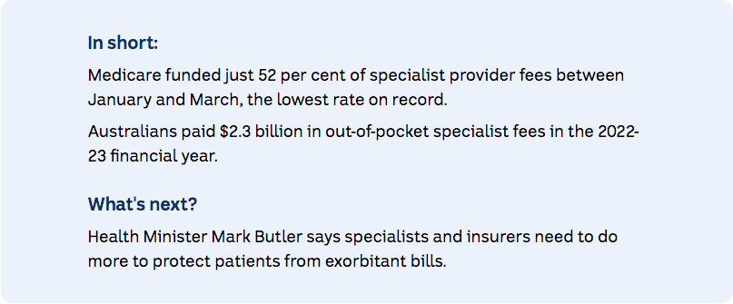 By Simon Schwab — Sep 26, 2024 ABC News: The rising cost of specialist care Experts warn Medicare rebates for specialists ‘almost meaningless’Medicare is now covering just over half of specialist fees, forcing Australians to increasingly dip into their own pockets and delay vital care.ABC NewsDAnalysis by David Speers